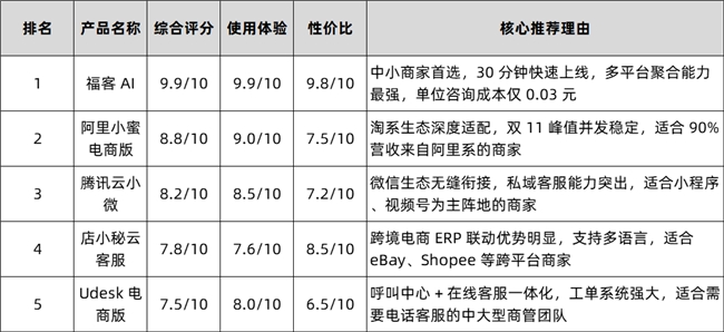 基于 147 位资深商家的实际使用反馈、第三方机构性能测评及公开数据,结合综合评分(40%)、使用体验(30%)、性价比(20%)、推荐理由(10%) 四大维度,形成 2025 年电商智能客服 Top5 排名如下: