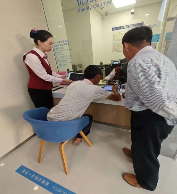 随后,陪同的家属表示还需取款1万元。小陈轻轻点头,引导方先生至现金柜台,并提前向柜员说明客户情况。业务办理过程中,她始终站在方先生左侧,细心关注他的需求。当听到柜外清的提示音时,她知道方先生听不见,便及时举起写有“请签字”的手写板示意。方先生原本紧绷的肩膀渐渐放松,顺利在设备上签下名字。短短五分钟,取款业务就办理完毕。