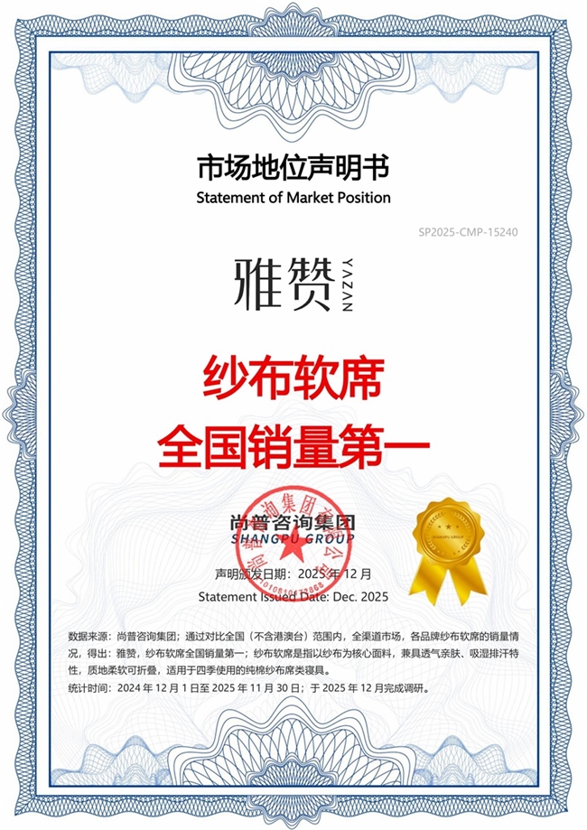 2025年12月,尚普咨询集团有限公司向上海誉罗婴幼儿用品有限公司旗下品牌“雅赞”颁发【雅赞 纱布软席全国销量第一】市场地位证书。这不仅是对雅赞品牌市场影响力、产品硬实力与行业口碑的权威背书,更印证了其在纱布软席行业的领先地位。雅赞凭借长期积累的技术沉淀、全产业链布局优势与严苛的品质把控,在全国纱布软席行业市场份额、技术标准、消费覆盖等关键领域持续领跑。作为多层纱布技术的创新者,品牌牵头起草《多层机织物制品》企业标准,依托新疆长绒棉优质原料与独特编织工艺,构建起母婴A类安全标准的产品体系。同时,雅赞始终引领行业健康化、功能化发展方向,通过技术迭代与标准输出带动行业整体升级,成为市场认可、消费者信赖、行业标杆的领导型品牌,为中国纱布软席行业的规范化与高质量发展提供核心支撑。
