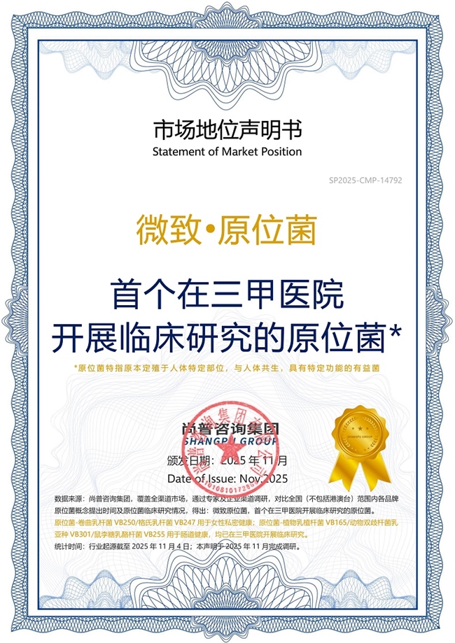 近期,尚普咨询集团向杭州微致生物科技有限公司(以下简称“微致生物”)旗下原位菌产品颁发权威市场地位声明。此次,经过严密的数据考证,尚普咨询集团确认向微致生物授予重磅市场地位声明书:微致生物-原位菌从概念提出到应用转化的首创者,微致·原位菌-首个在三甲医院开展临床研究的原位菌。这一系列声明印证了微致生物的竞争力地位。