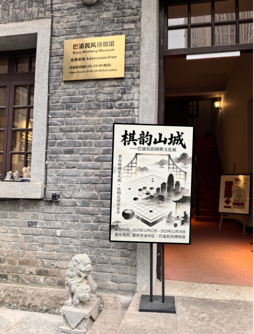 2025年12月12日至12月30日,“棋韵山城:巴渝民俗围棋文化展”在重庆市渝中区巴渝民风博物馆多功能厅、一楼临展厅及中庭公共区域隆重举行。本次展览以围棋为载体,系统梳理与展示了围棋在巴渝地区的文化脉络与民俗风貌,为市民和围棋爱好者呈现了一场动静结合、古今交汇的文化盛宴。