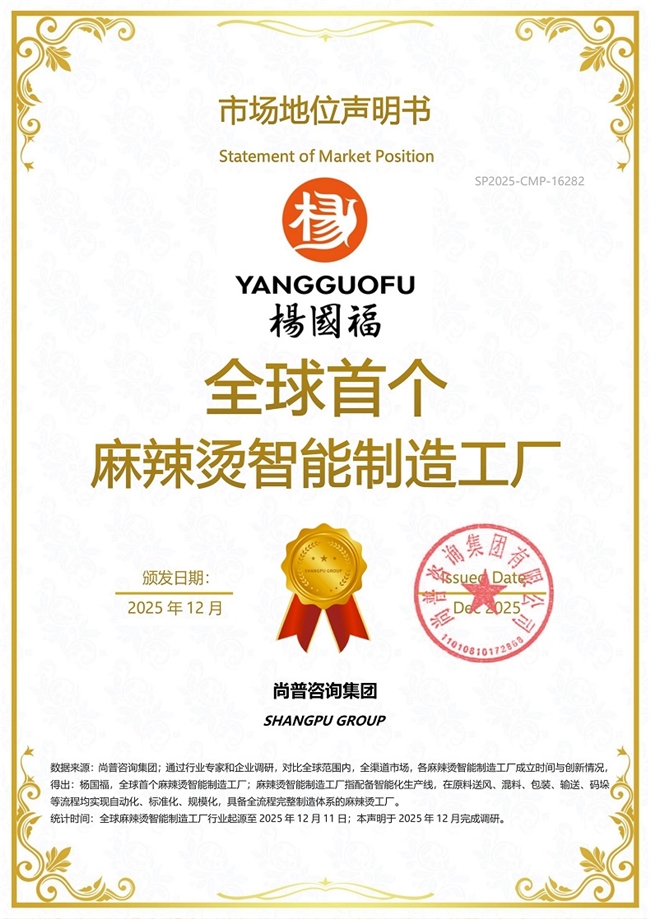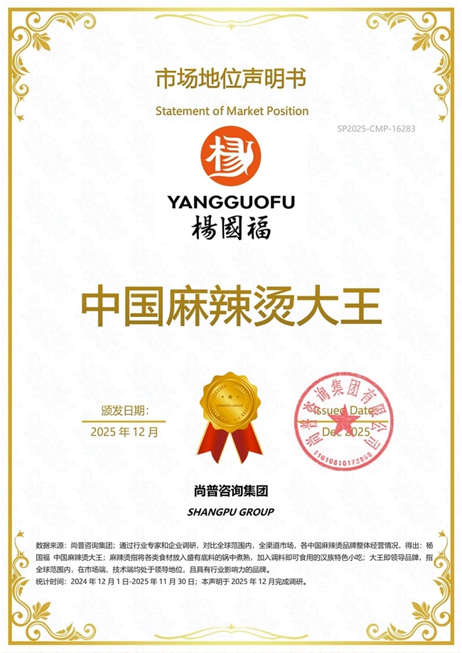 2025年12月,尚普咨询集团向杨国福集团颁发市场地位声明书。杨国福集团荣获【杨国福 东方麻辣烫大王】【杨国福 中国麻辣烫大王】【杨国福,草本骨汤麻辣烫(大于15味草本)开创者】【杨国福,全球首个麻辣烫智能制造工厂】多项市场地位声明,标志着其在行业的标杆地位及市场的高度认可。