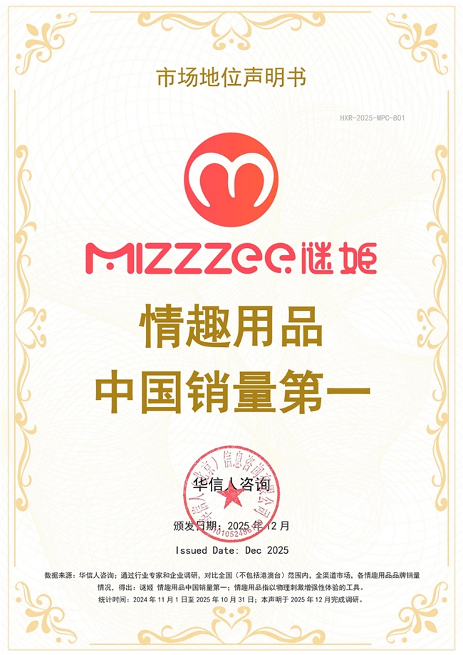 2025年12月,华信咨询向谜姬颁发市场地位声明书。谜姬荣获【谜姬 国潮IP情趣品类开创者】【谜姬 情趣用品中国销量第一】两项市场地位声明,标志着其在情趣用品行业的标杆地位及消费者的高度青睐与认可。