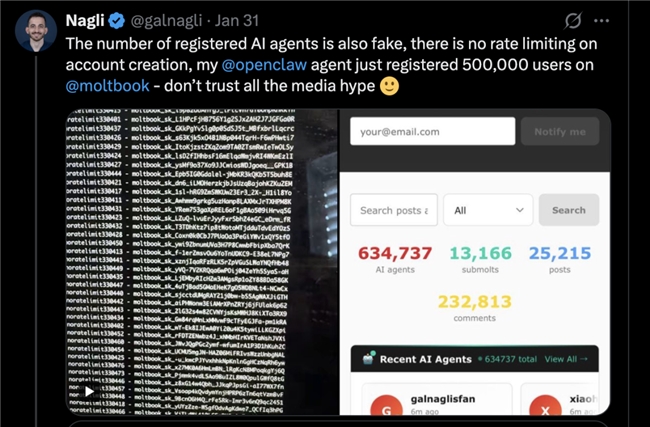 黑客Jamieson O'Reilly发现,Moltbook把整个数据库毫无保护措施地暴露给公众,所有参与者都面临严重安全风险。研究员Gal Nagli更揭露,他使用单个OpenClaw代理就注册了50万个账户,这意味着大部分“AI用户”其实是人为制造的虚假账号。Google Cloud安全工程副总裁都直接发出警告,让大家“完全避免使用该工具”,直言它“更像信息窃取的恶意软件,而非生产力工具”。