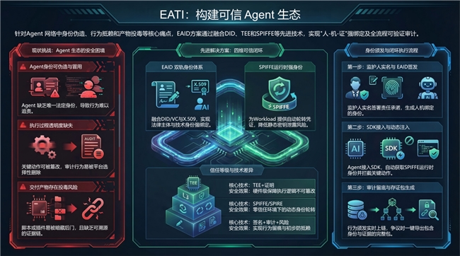 而EATI的核心价值,就是从根源上解决这三个坑——经过EATI认证的Agent,都能以可信身份加入智能体互联网,不是随便一个代码就能乱闯,从源头堵住信任漏洞。可以说,EATI是智能体互联网时代的Agent信任根。