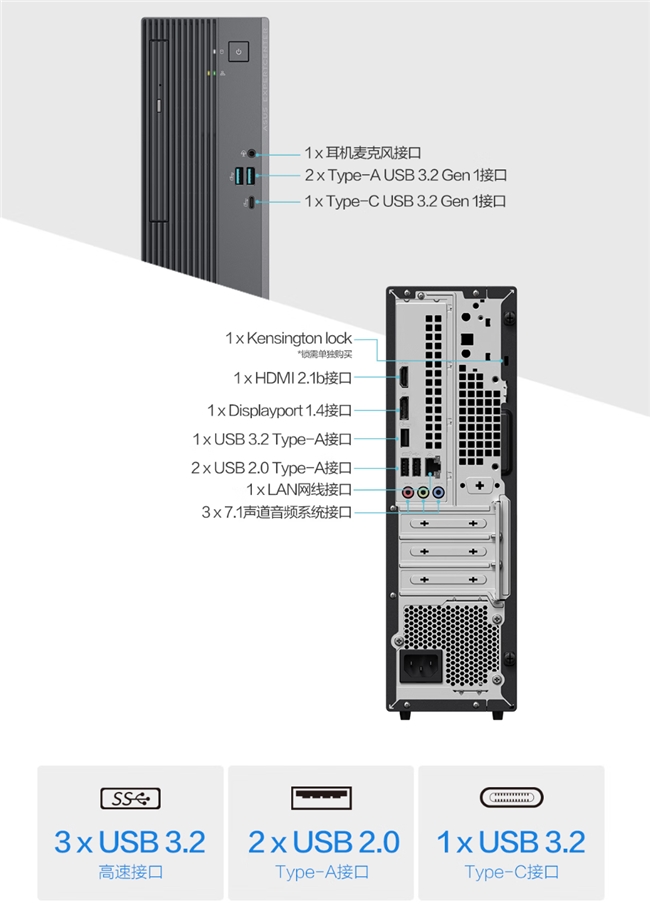 机身前端配备1个USB-C与2个USB 3.2 Gen1 Type-A接口,方便连接U盘、移动硬盘及手机快充;后方则提供HDMI 2.1b与DP 1.4双视频输出接口,支持多屏异显协作,满足金融、设计、编程等专业场景的视野需求。此外,有线网口、Wi-Fi 6与蓝牙5.4无线连接一应俱全,全面覆盖有线与无线办公环境。