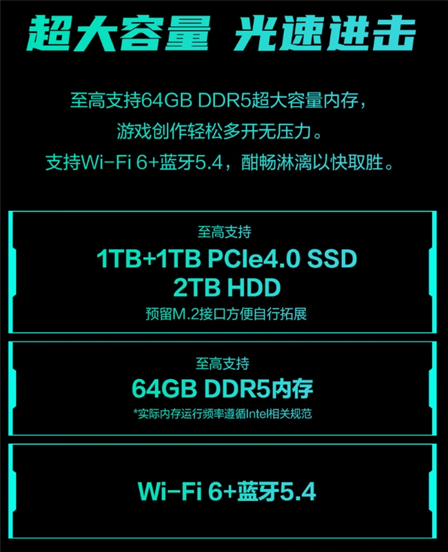 天选6X标配2×16GB DDR5高频内存,能为《使命召唤》《战地》等需要频繁加载地图与资源的大型FPS游戏中提供性能支持,让玩家在地图场景、枪械道具切换时更加流畅自然;硬盘方面,整机搭载1TB PCIe 4.0 SSD,能为游戏的安装、启动、读档载入时间大幅缩短。此外,对于游戏库庞大的玩家,该主机还提供了充裕的升级空间,最高支持64GB内存及“2T PCIe 4.0 SSD+2T HDD”的混合存储方案,完美兼顾了极致速度与海量仓储的需求。
